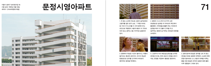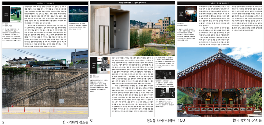 ![]() 안녕하세요. 뉴스레터 구독자 여러분! 이따금 선선한 가을바람이 불어오기 시작한 요즘, 잔디밭 나무 그늘 밑에서 책 한 권 읽으며 가을을 즐길 수 있다면 너무 좋을 것 같은데요. 그래서 준비한 소식!(두구두구두구) 바쁜 일상 속, 잔디밭은 못가도 영화관은 꼭 챙겨가는 우리 뉴스레터 구독자 여러분들을 위한 <아카이브 프리즘13호: 한국영화의 장소들>이 발간되었습니다.(우와~박수 짝짝짝) <아카이브 프리즘>은 한국영상자료원에서 분기별로 발행 중인 영화잡지인데요. 발행 때마다 ‘영화’와 관련된 하나의 주제를 정해서 그 주제에 맞는 내용을 약 160페이지에 걸쳐 심도 있게 다루는, 그야말로 씨네필들의 필수 구독지라고 할 수 있죠. 이번 <아카이브 프리즘13호: 한국영화의 장소들>은 그 제목에서 알 수 있듯이 한국영화의 공간들을 다양한 방식으로 조망하고 있는데요. 영화에서 ‘장소’가 갖는 의미는 단순 물질적 공간의 개념을 넘어 보다 다층적이고 풍부하죠. 이야기적 맥락 속에서 영화의 주제와 장르, 정서, 인상에 큰 영향을 미치는 것이 영화 속 ‘장소’라고 할 수 있을 텐데요. <아카이브 프리즘13호: 한국영화의 장소들>은 영화 속 장소들을 단순히 이야기가 펼쳐지는 무대로 인식하는 것을 넘어, ‘장소’가 만들어내는 의미의 세계를 들여다보는 ‘공간학’적 탐구에 초점을 맞추고 있어요. ‘한국영화의 장소들’부터 ‘아파트’와 ‘군산소요’, ‘고전영화에 기록된 서울의 풍경’과 ‘한국영화 공간학’까지, 총 5가지 섹션을 통해 한국영화에서 다뤄진 장소들에 대해 깊게 탐색하고 있답니다. 자 그럼 지금부터 뉴스레터와 함께 <아카이브 프리즘13호: 한국영화의 장소들>을 미리 만나러 가보실까요? 시원한 가을바람과 함께, 10월의 뉴스레터 출발합니다.(뿜~뿜~) . . . 한국영화의 장소들 ![]() [<아카이브프리즘 13호: 한국영화의 장소들> 한국영화의 장소들(기생충, 소설가의 영화, 헤어질 결심)] <아카이브 프리즘 13호>에서 첫 번째로 살펴볼 섹션은 그동안 한국영화에 등장했던 26곳의 장소를 하나하나 세심하게 다루고 있는 ‘한국영화의 장소들’섹션 입니다. 이번 <아카이브 프리즘 13호>의 메인섹션이기도 한 ‘한국영화의 장소들’에서는 각 26곳 장소들의 영화 속 장면과 실제 장소 촬영 사진을 함께 보여주고 있는데요. 각각의 장소들이 영화 속에서 어떻게 의미망을 형성하는지 다양한 장면분석과 이미지들을 통해 설명함과 동시에, 연출자가 이 장소에 대해 어떤 시선을 가졌는지 등을 함께 실어 독자들의 이해를 돕고 있어요. 아련한 추억과 생생한 감정이 남아있는 26편의 영화들을 따라가다 보면 어느새 영화 속 장소 한복판에 서 있는 자신을 발견할 수 있을 거예요>_< 아파트 ![]() [<아카이브프리즘 13호: 한국영화의 장소들> 아파트(문정시영아파트)] 두 번째 섹션은 ‘아파트’섹션입니다. 그야말로 한국인의 피땀눈물이 녹아있는 상징적 공간인 아파트에 대해 영화적 시선으로 탐구해보는 섹션인데요. 한국인들의 거주 공간인 아파트는 지역적인 좌표와 위상, 연식, 외양, 건축법, 구조 등에 따라 영화의 여러 장르 안에서 다양하게 담겨왔어요. 또한 어느 시대에, 어느 지역에, 어떤 모양으로 지어진 아파트인가에 따라 그 공간 자체로 영화 속에서 특정 의미망을 형성해왔는데요. 마포아파트에서 둔촌주공까지, 총 12개의 대표적 아파트를 배경으로 제작된 영화들을 통해 한국영화 속 장소에 대한 색다른 시선을 느껴보세요. 아파트에 수많은 애환이 녹아있는 우리들이기에 더욱 눈길이 갈 수밖에 없는 섹션일 수 있겠네요! 군산 소요 ![]() [<아카이브프리즘 13호: 한국영화의 장소들> 군산소요] 이번에 살펴볼 섹션은 ‘군산소요’섹션입니다. ‘소요: 자유롭게 이리저리 슬슬 거닐며 돌아다님.’이라는 뜻답게 한국영화 속에 등장한 군산의 이곳저곳을 산책하듯 살펴보며 독자들에게 마치 군산에 영화기행을 와 있는듯한 느낌을 주는 섹션인데요. 군산을 배경으로 제작된 대표적 영화들인 <8월의 크리스마스>(허진호, 1998)와 <타짜>(최동훈, 2006), <군산: 거위를 노래하다>(장률, 2018) 속 장소들을 영화장면과 함께 소개하고 있어요. 일제강점기에서 연유한 근대 건축물과 굴곡진 역사의 흔적 위로 오늘날의 일상 경제가 순환하고 있는 군산 구도심 일대를 ‘군산소요’섹션을 통해 천천히 소요해보세요! ‘한국영화 공간학’과 ‘고전영화에 기록된 서울의 풍경’ ![]() [<아카이브프리즘 13호: 한국영화의 장소들> ‘한국영화 공간학’, ‘고전영화에 기록된 서울의 풍경’ <아카이브프리즘 13호>곳곳에 스며들어있는 ‘한국영화 공간학’섹션은 한국영화 속 특정 장소들을 ‘공간학’적 시선으로 탐구해보는 섹션이라고 할 수 있어요. 서두에서 언급했듯, ‘공간학’적 시선이란 장소가 만들어내는 의미의 세계를 들여다보려는 노력이라고 할 수 있는데요. 육교, 지하철, 이대앞, 플랫폼, 반지하, 공중목욕탕, 골목과 대로라는 공간들이 ‘공간학’적 시선을 만나 어떤 의미들로 재해석되는지 잘 살펴보세요! 마지막으로. ‘고전영화에 기록된 서울의 풍경’섹션에서는 도시공학·역사 
